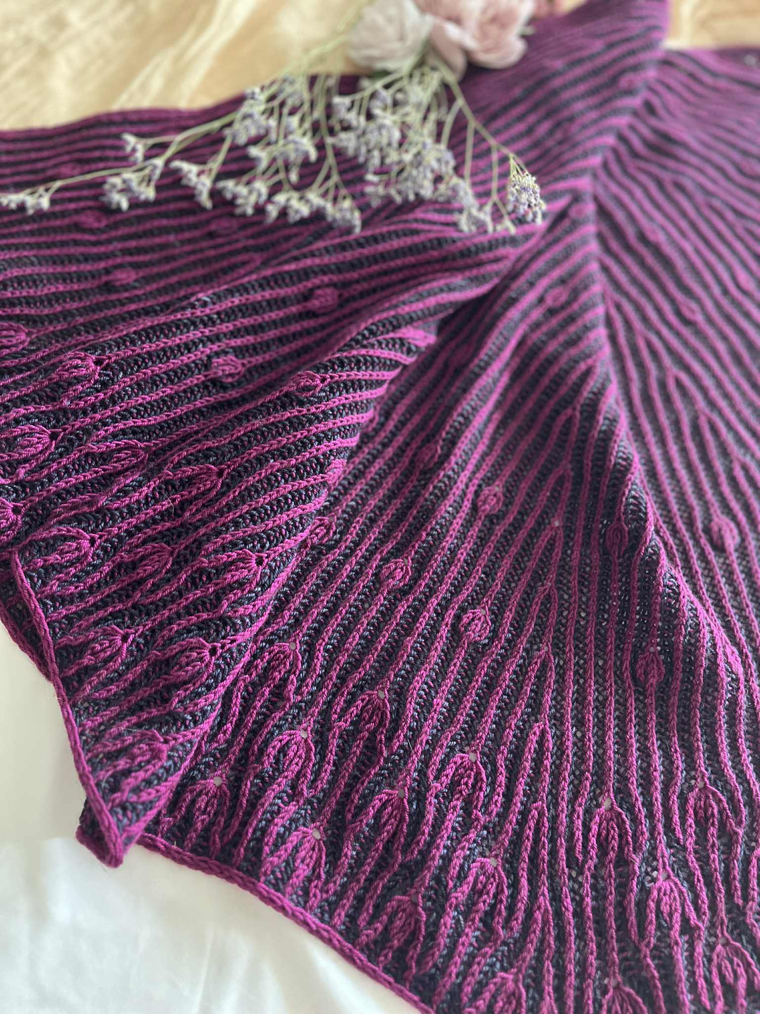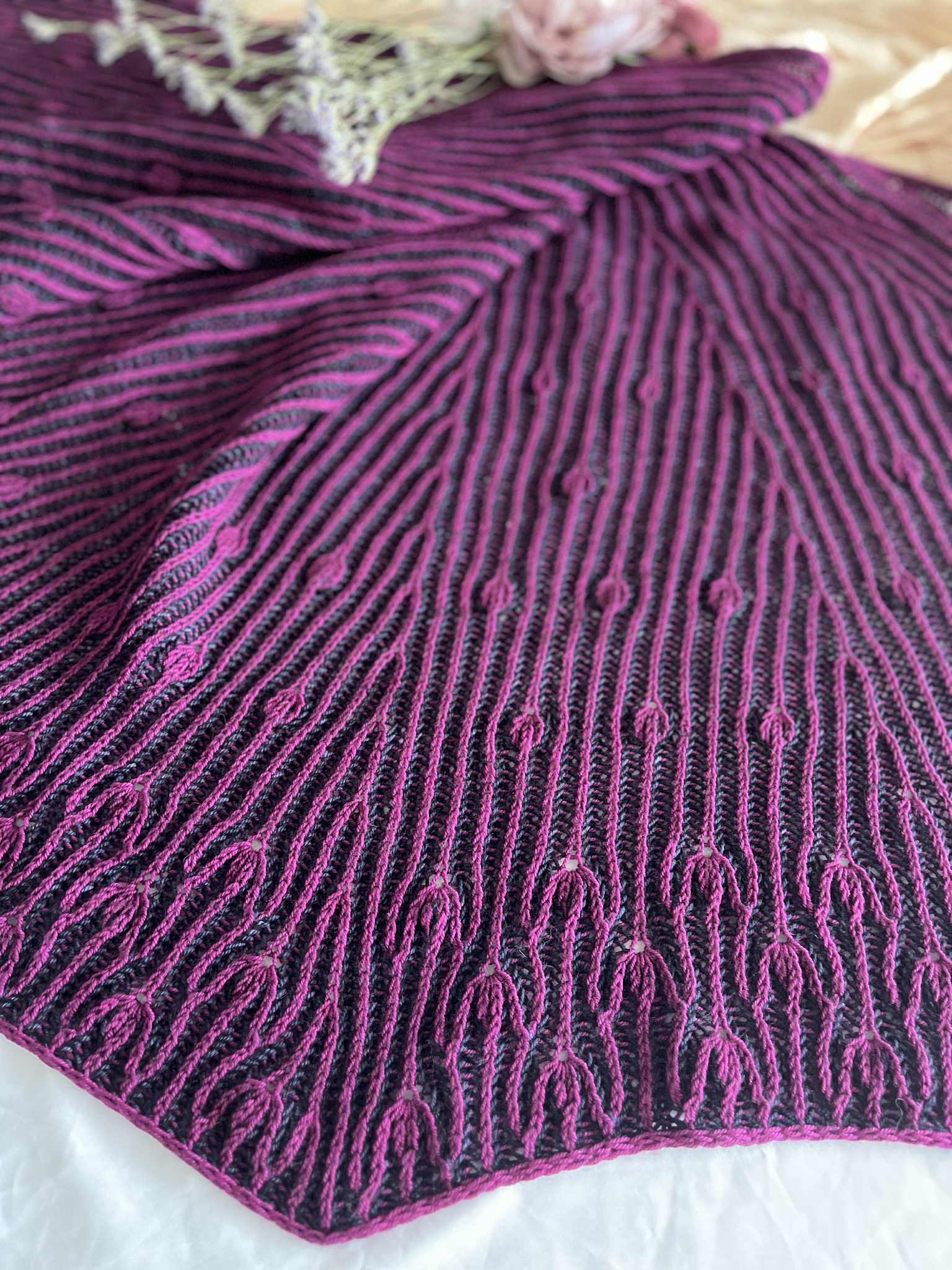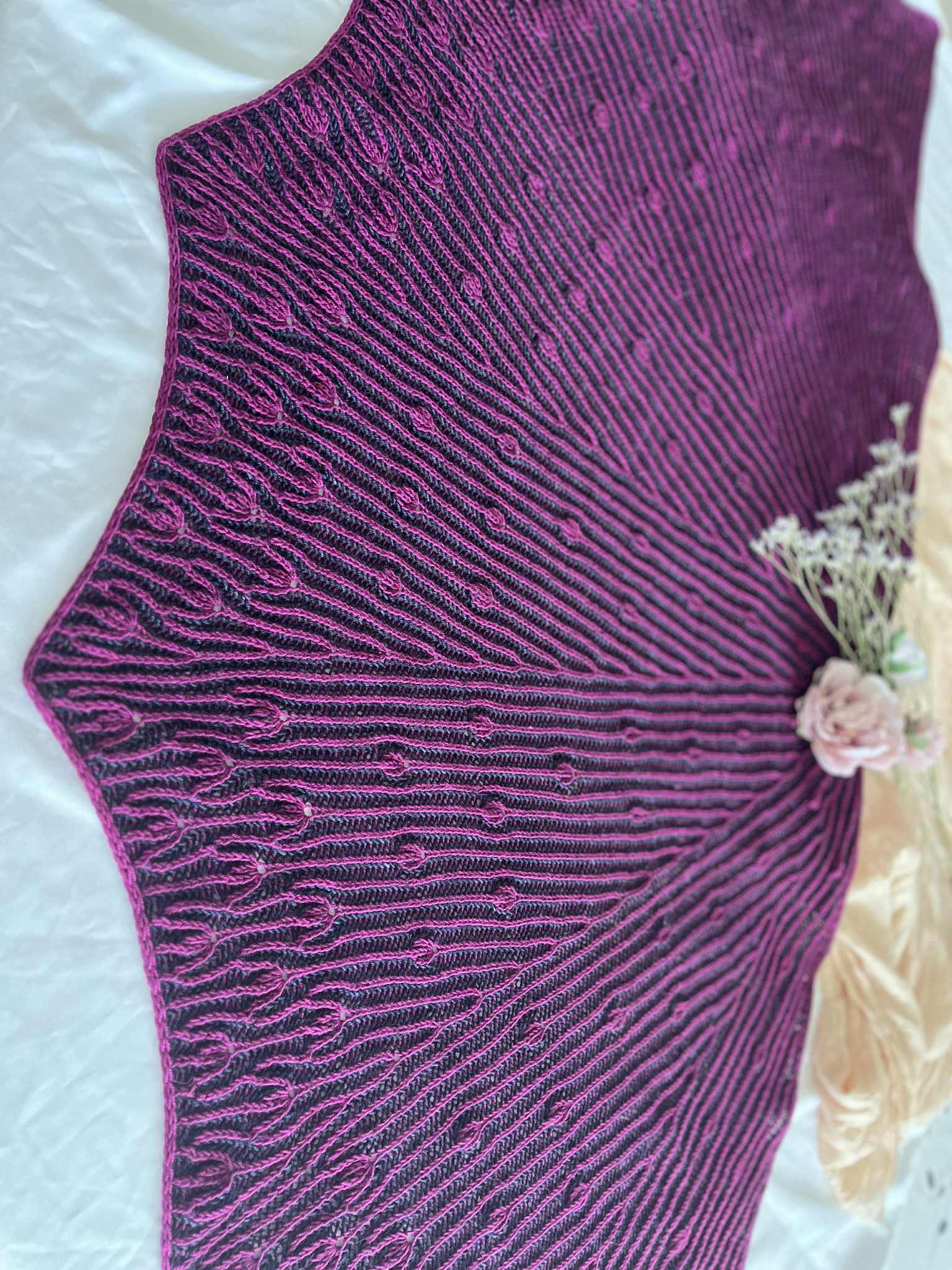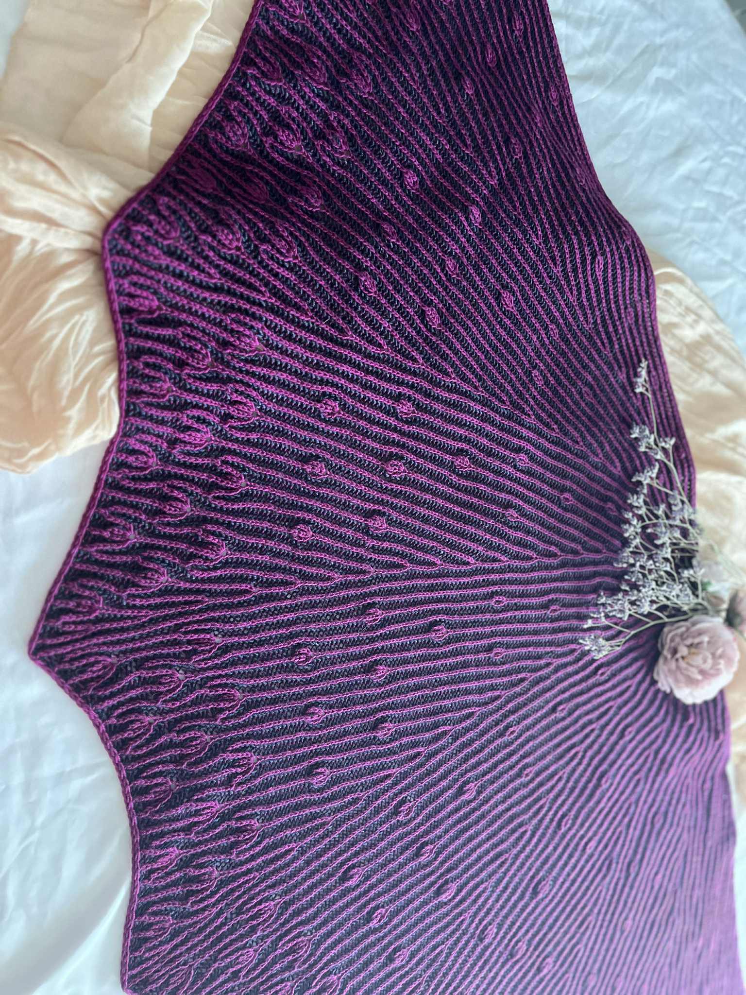 Comme des boutons de fleurs prêts à éclore au cœur du printemps, ce châle se déploie dans une danse délicate et rythmée.