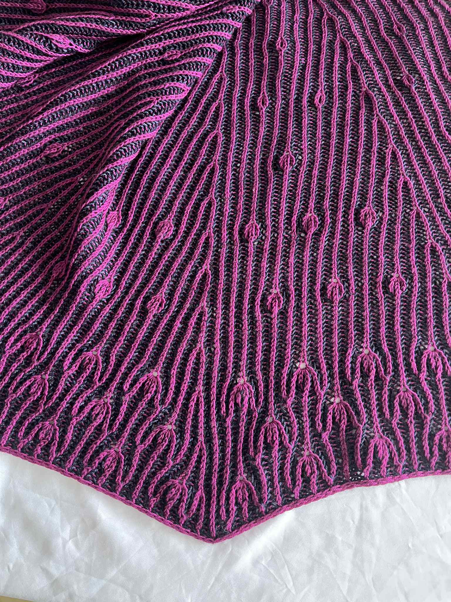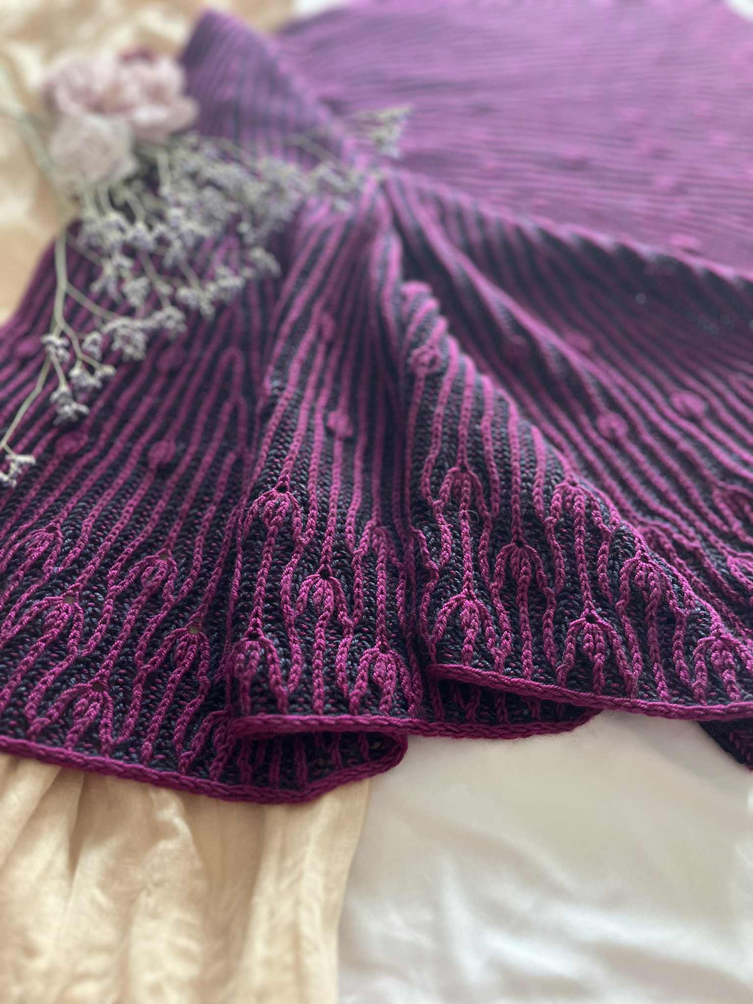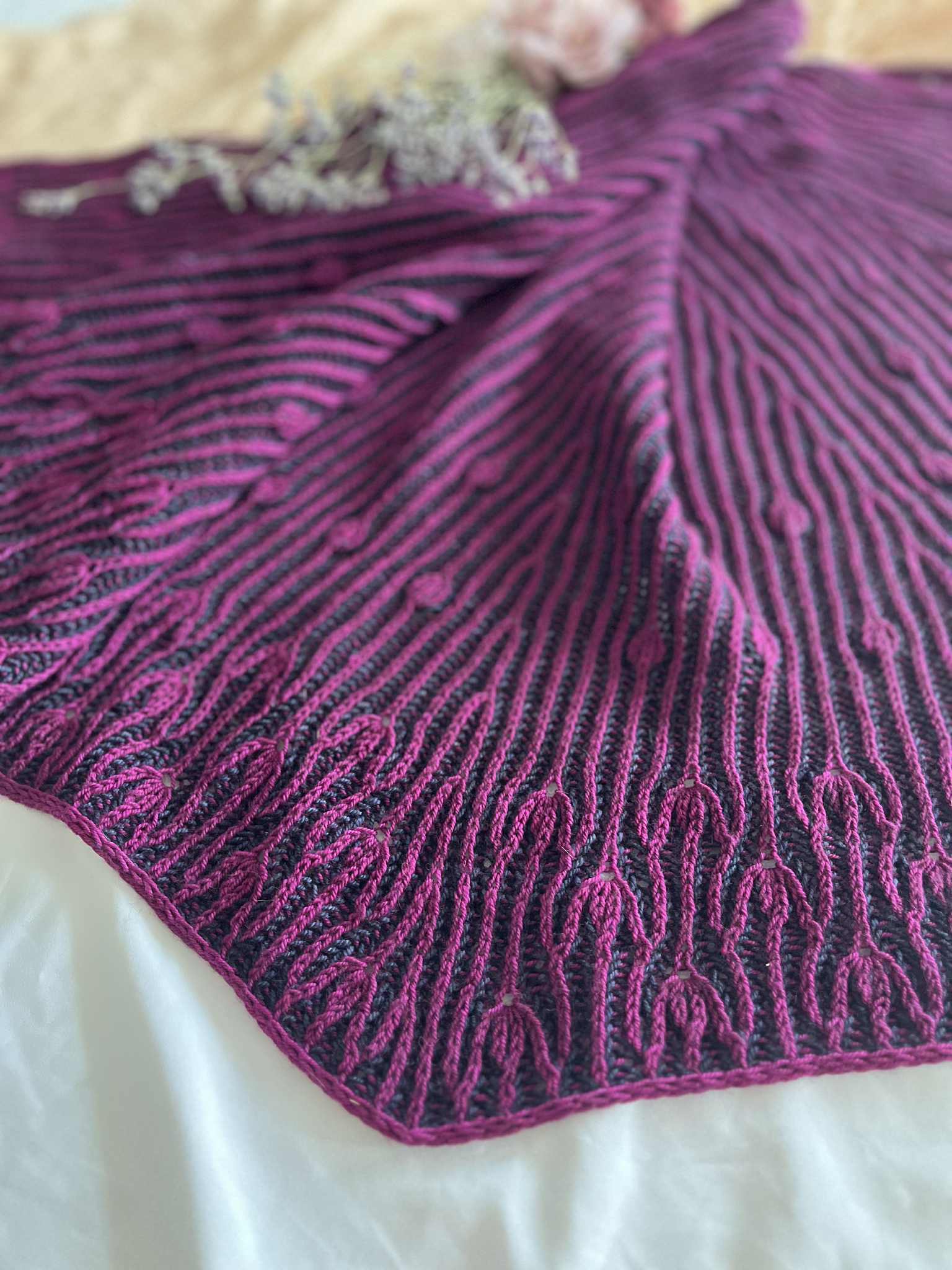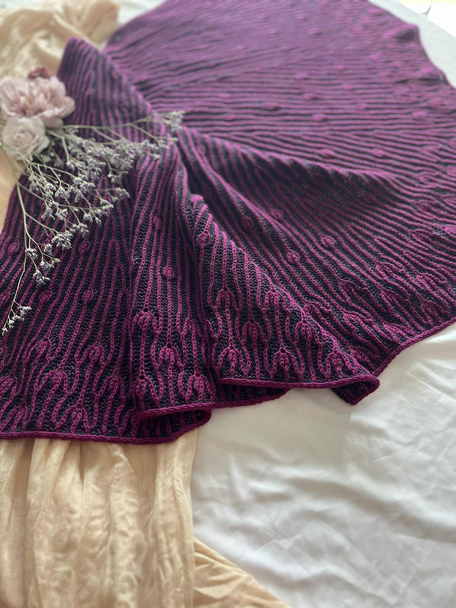 Comme des boutons de fleurs prêts à éclore au cœur du printemps, ce châle se déploie dans une danse délicate et rythmée.