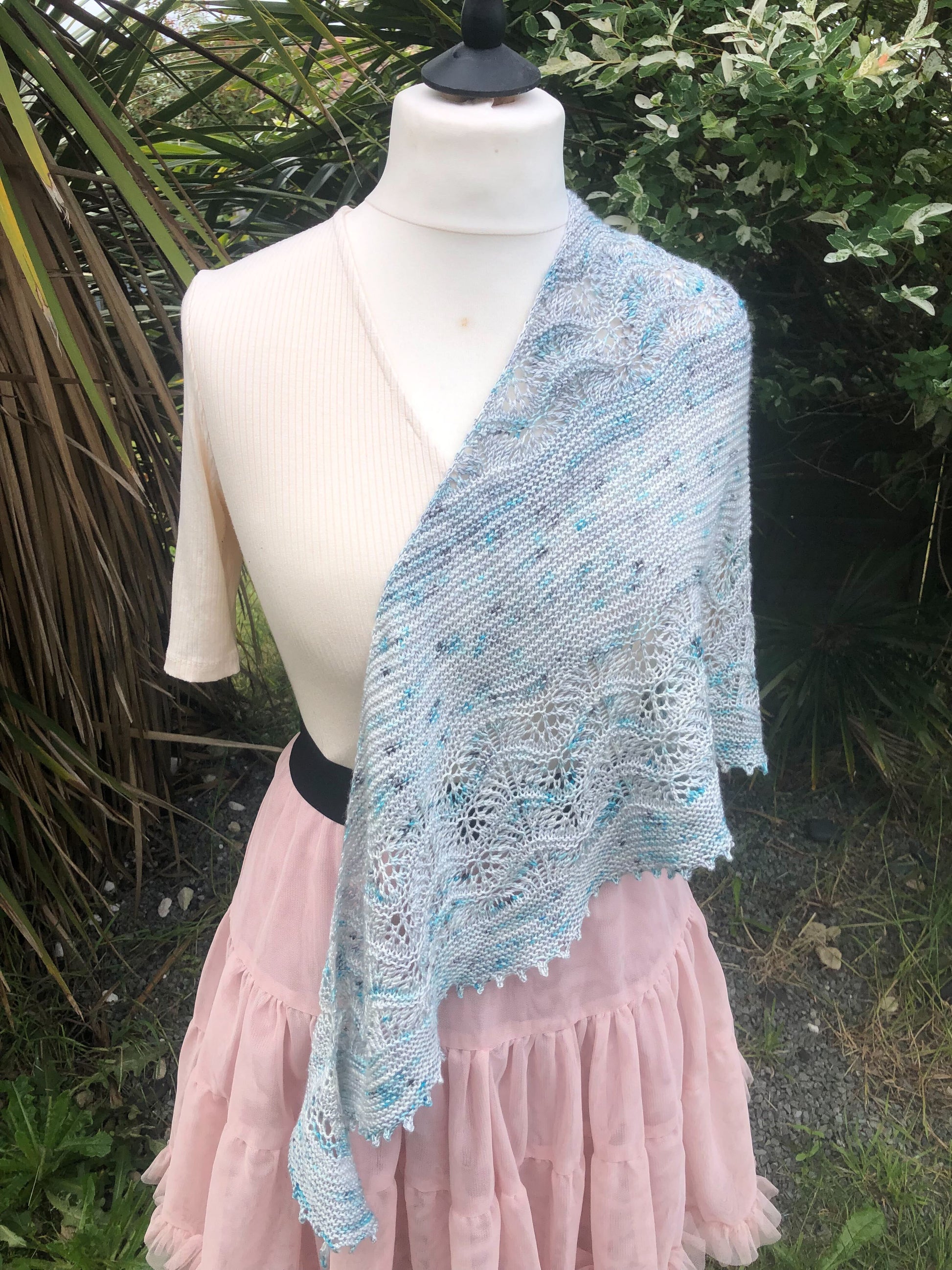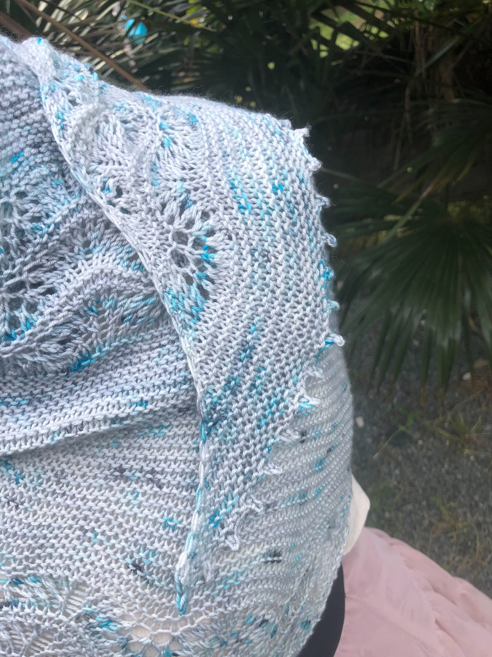 Le châle Azuré est issu de ma collaboration avec Nathalie et sa très jolie base Céleste en merino et soie. Quand j’ai reçu mes écheveaux, j’ai tout de suite imaginé un châle aérien et tout en longueur pour pouvoir le poser délicatement sur ses épaules, tel un papillon ou encore autour de son cou avec un tombé féminin sur l’épaule. La forme telle une aile de papillon s’est alors imposée à moi et le nom facilement trouvé également.