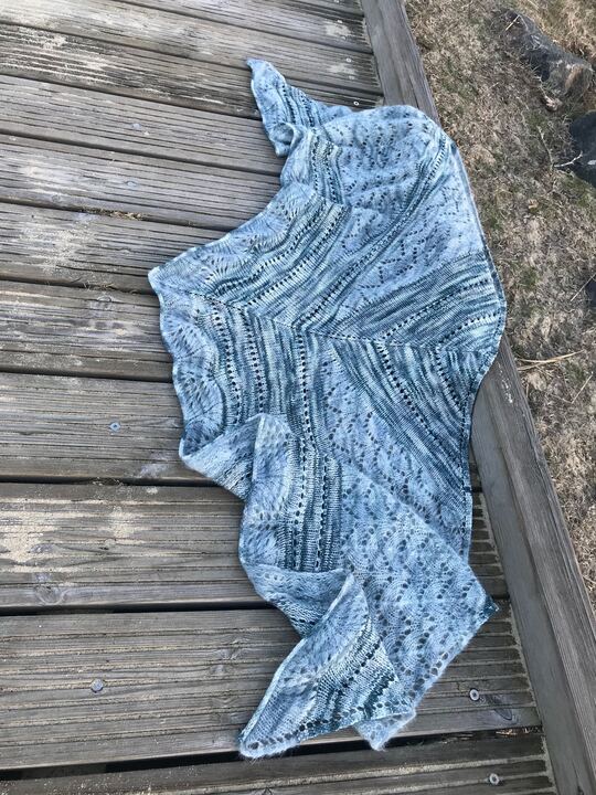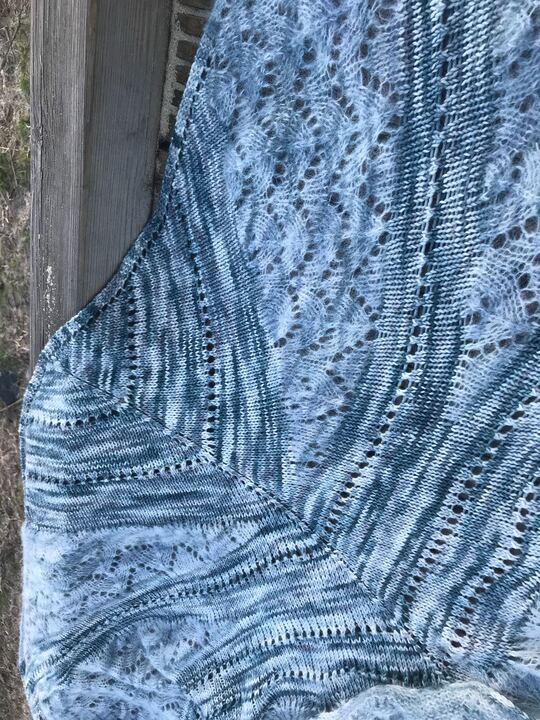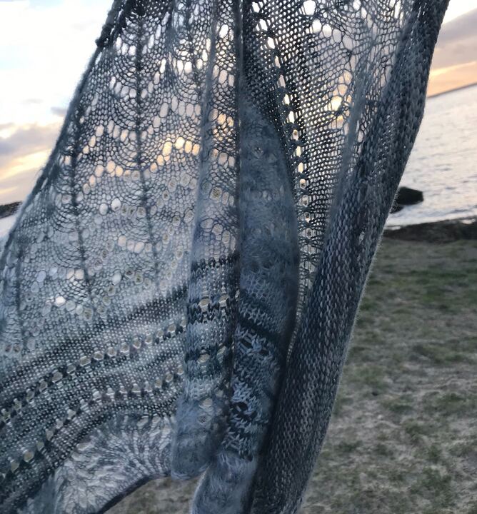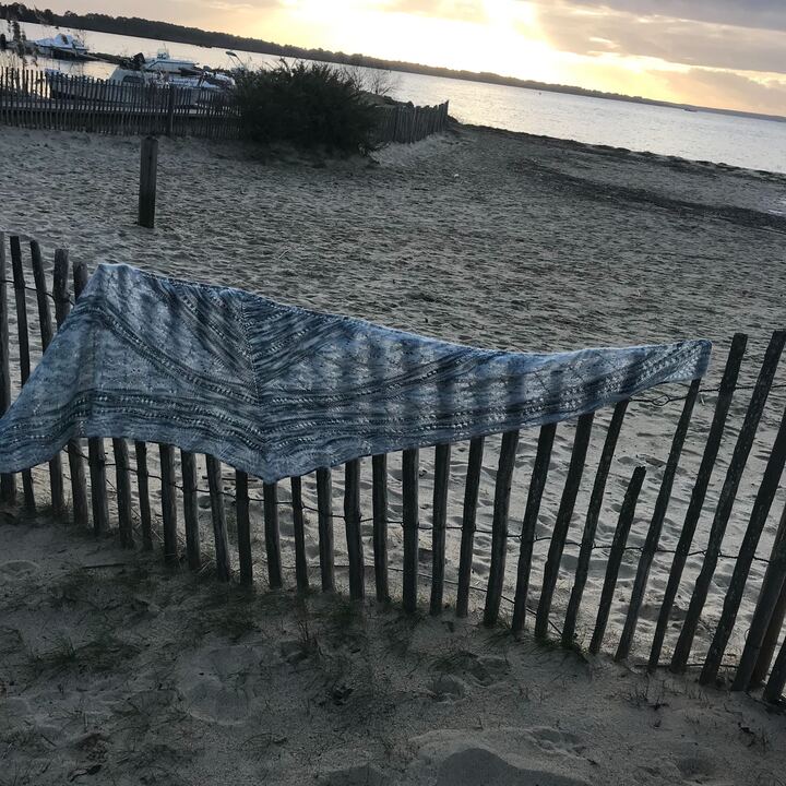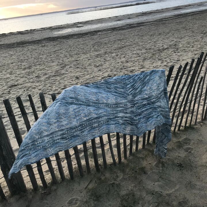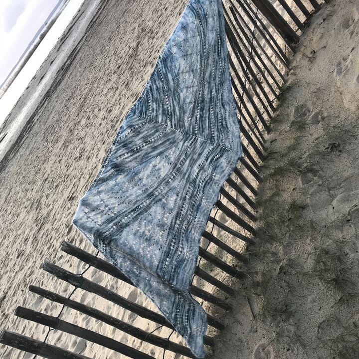 Pour ce châle, tu dois obtenir 16 mx 28 rgs pour un échantillon jersey de 10 cm x 10 cm en aiguilles 4, lavé et bloqué agressivement.