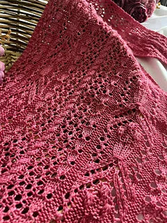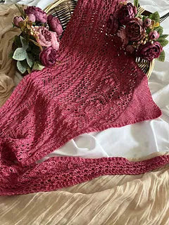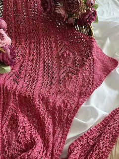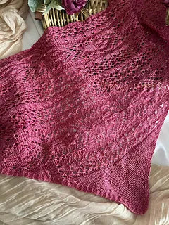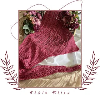 Le châle Mitsu est une caresse de dentelle, un souffle léger posé sur les épaules. Tricoté avec un seul écheveau de mérinos et soie, il dévoile un motif aérien, délicatement ajouré, qui danse sous les doigts comme une brise printanière.