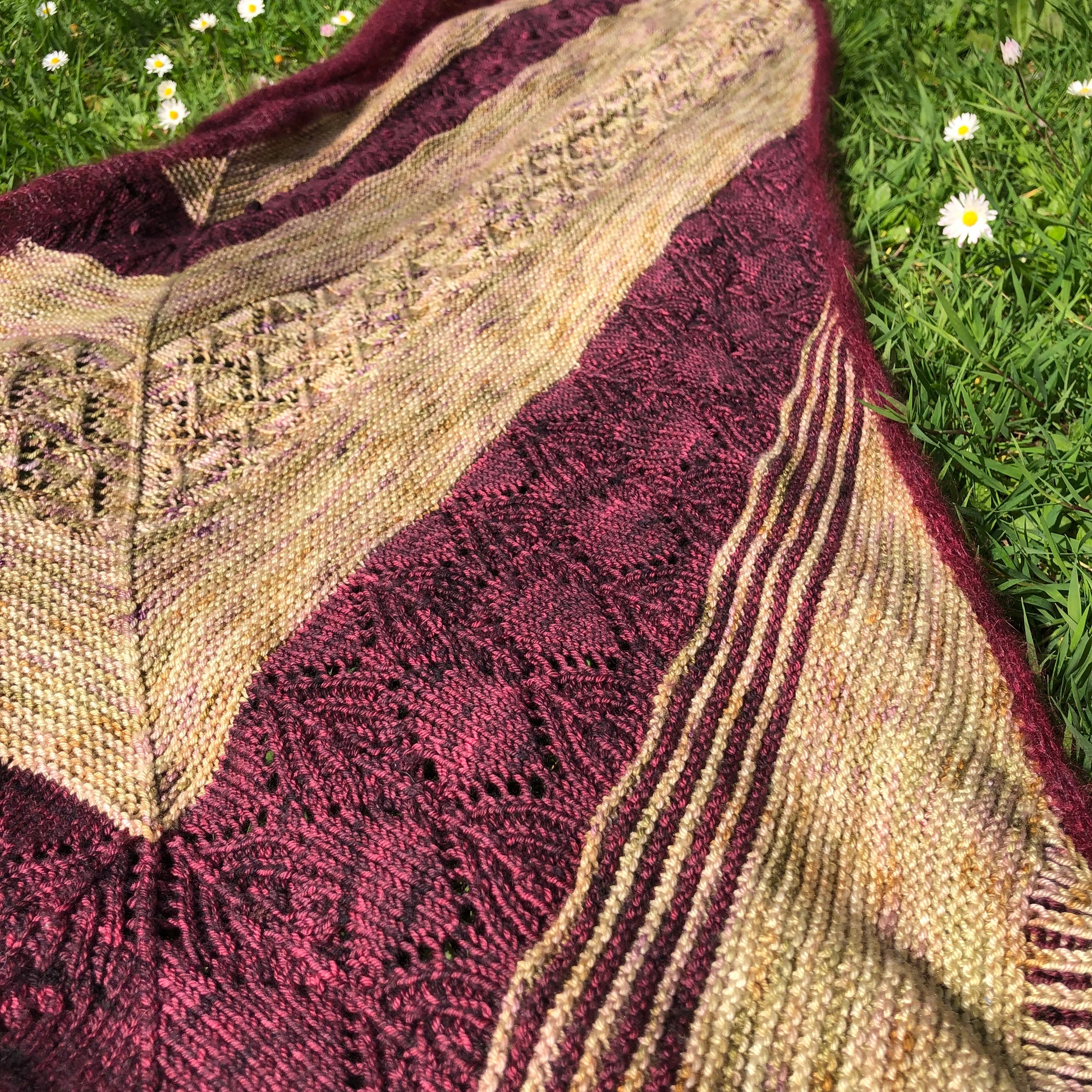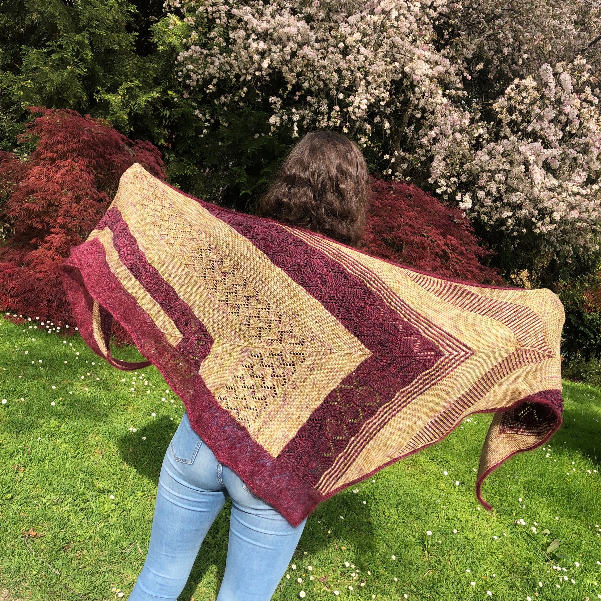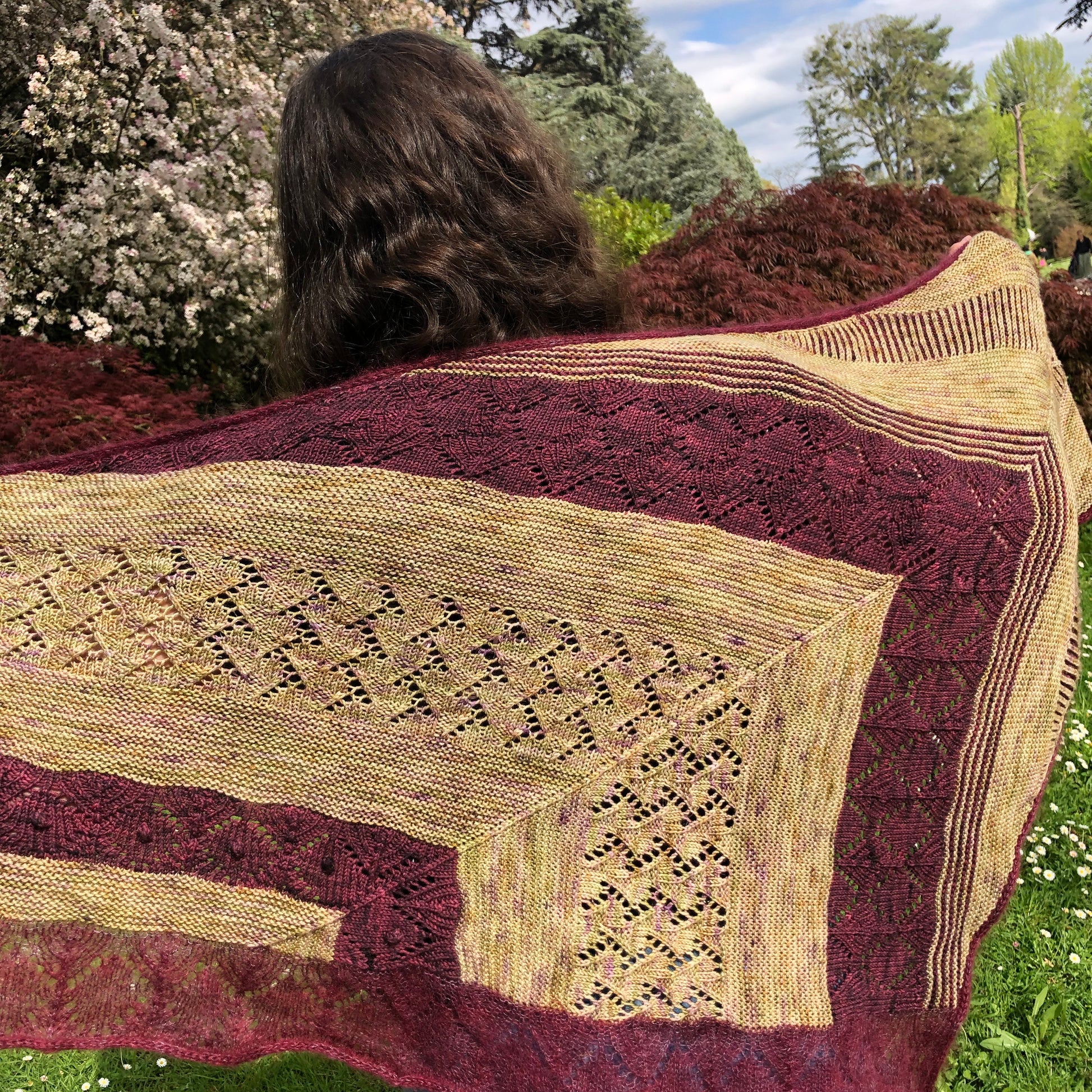 Promenade en Ecosse est un châle triangulaire asymétrique composé de différentes sections de points qui en font un projet addictif. J’ai choisi des couleurs profondes qui me rappellent les couleurs des paysages d’Ecosse.