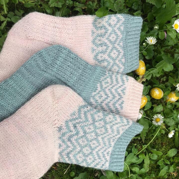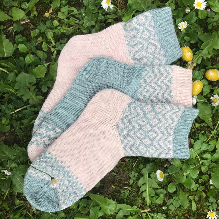 Les chaussettes Lucky Charm sont les premières chaussettes de la trilogie tribale. Elles se tricotent de la cheville à la pointe, avec un joli motif jacquard sur la cheville et la pointe d’inspiration amérindienne.