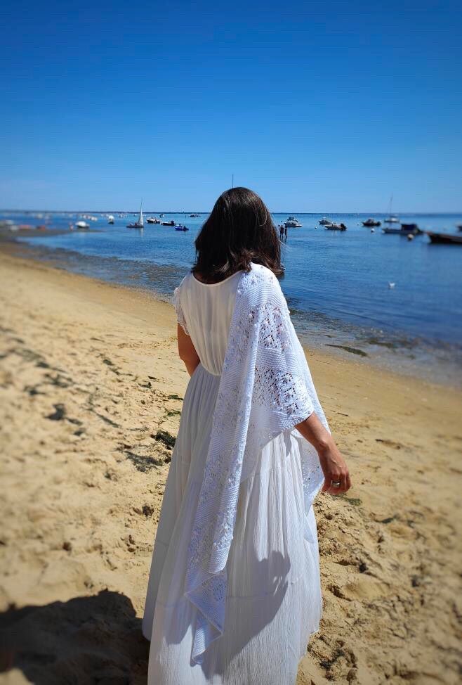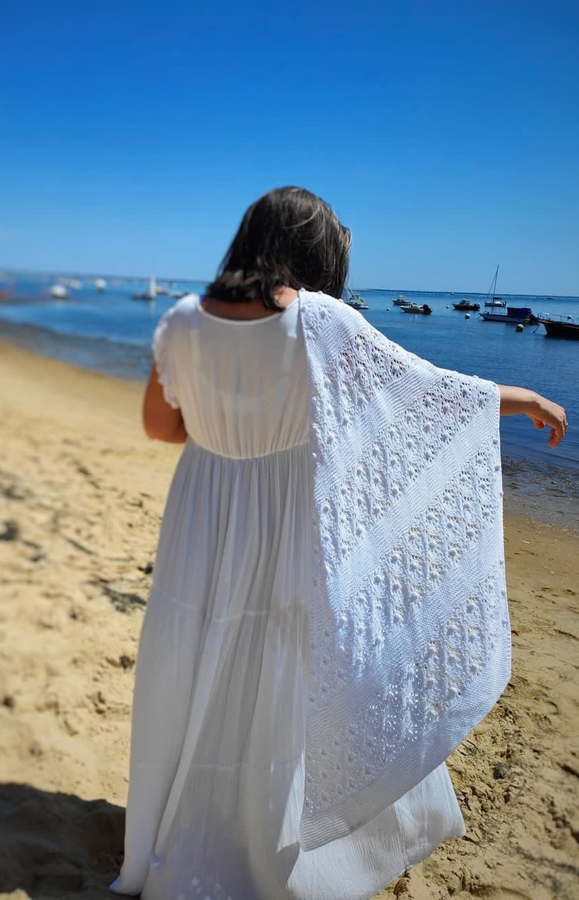 Elle se tricote de bas en haut avec des jeux d’augmentation et de diminution pour lui donner une forme de parallélogramme qui se positionne parfaitement sur vos épaules et sur vos bras. L’étole vous est proposée en 3 longueurs différents. Vous trouverez sur les photos la plus petite taille.