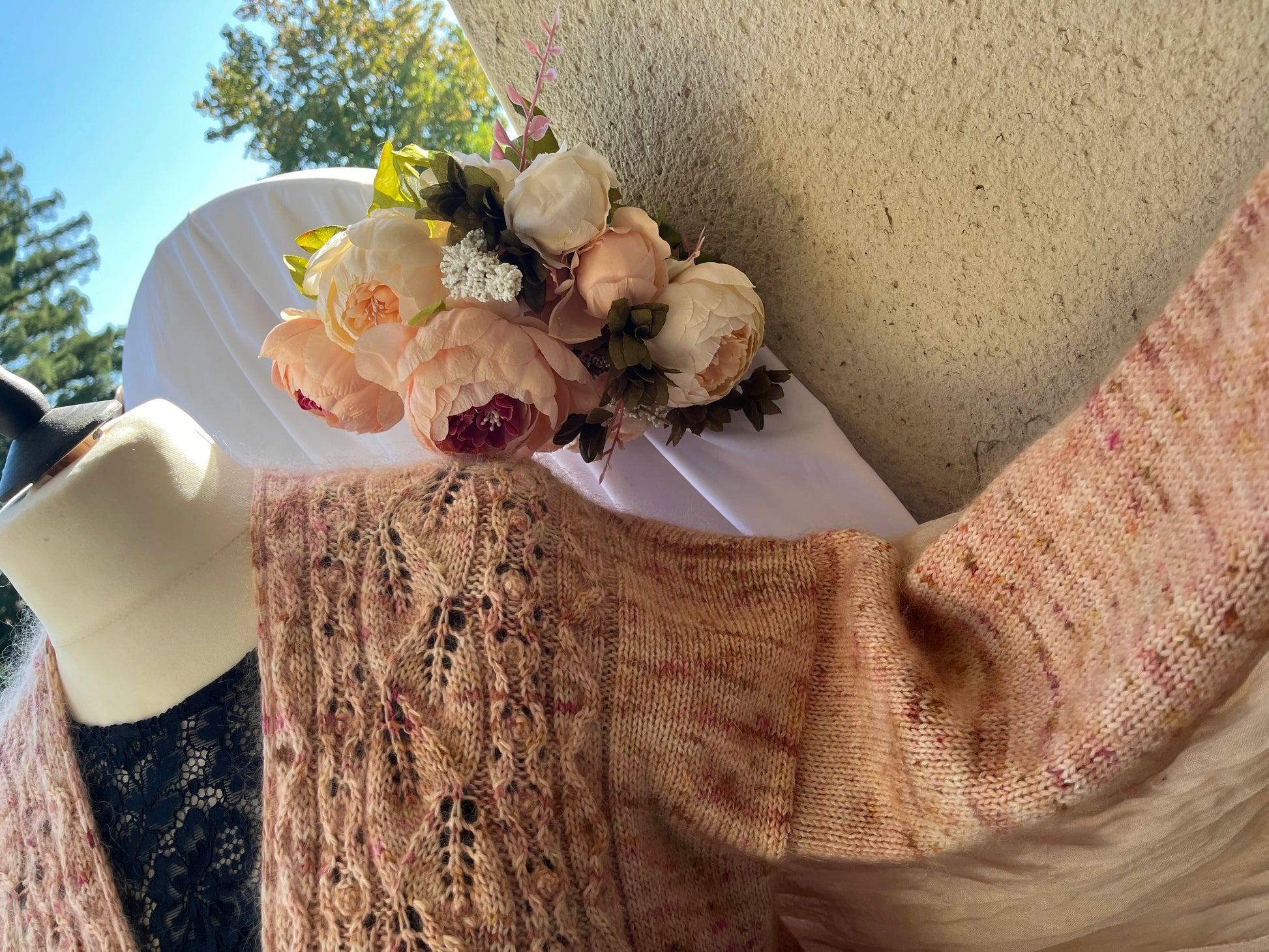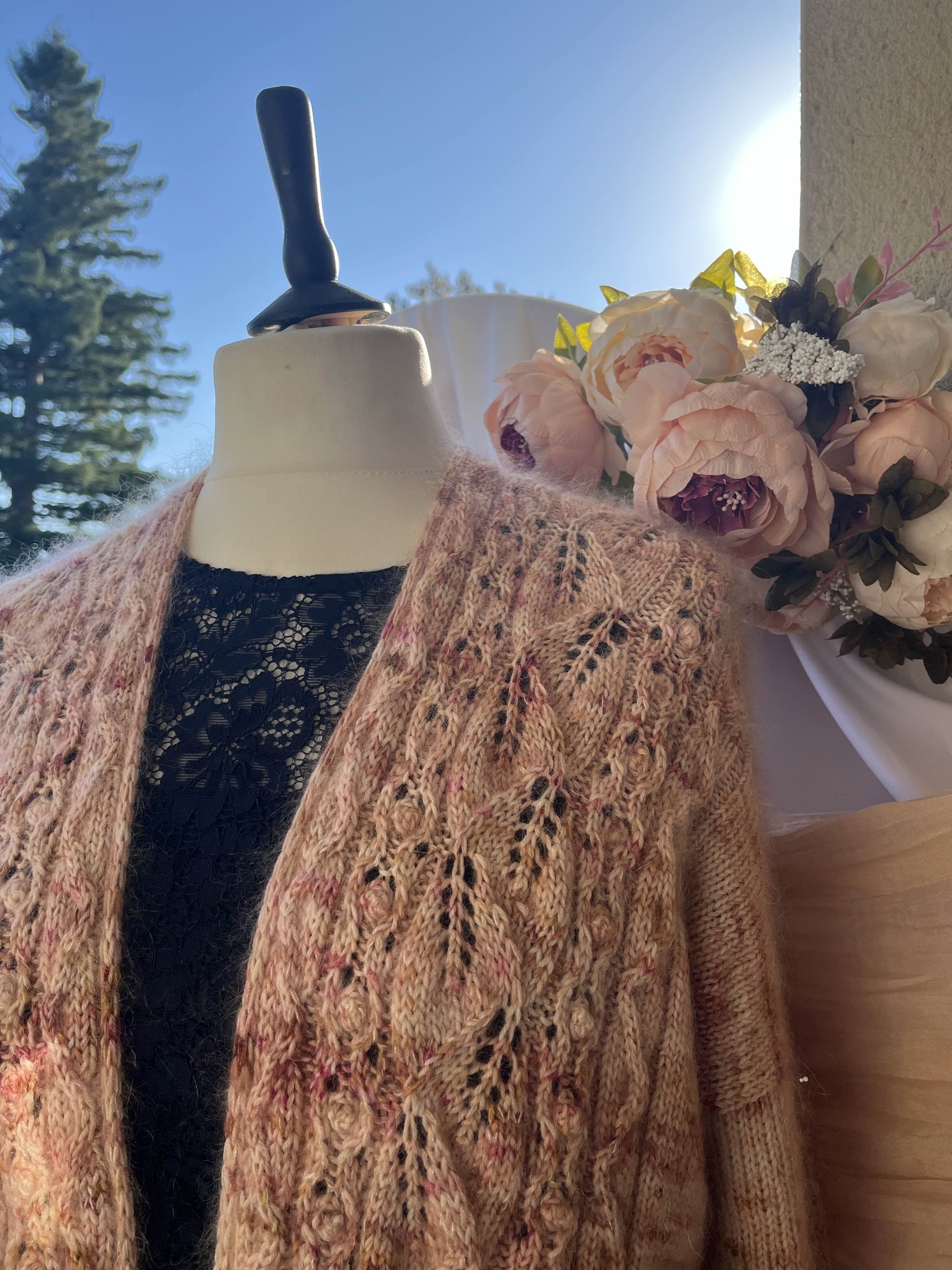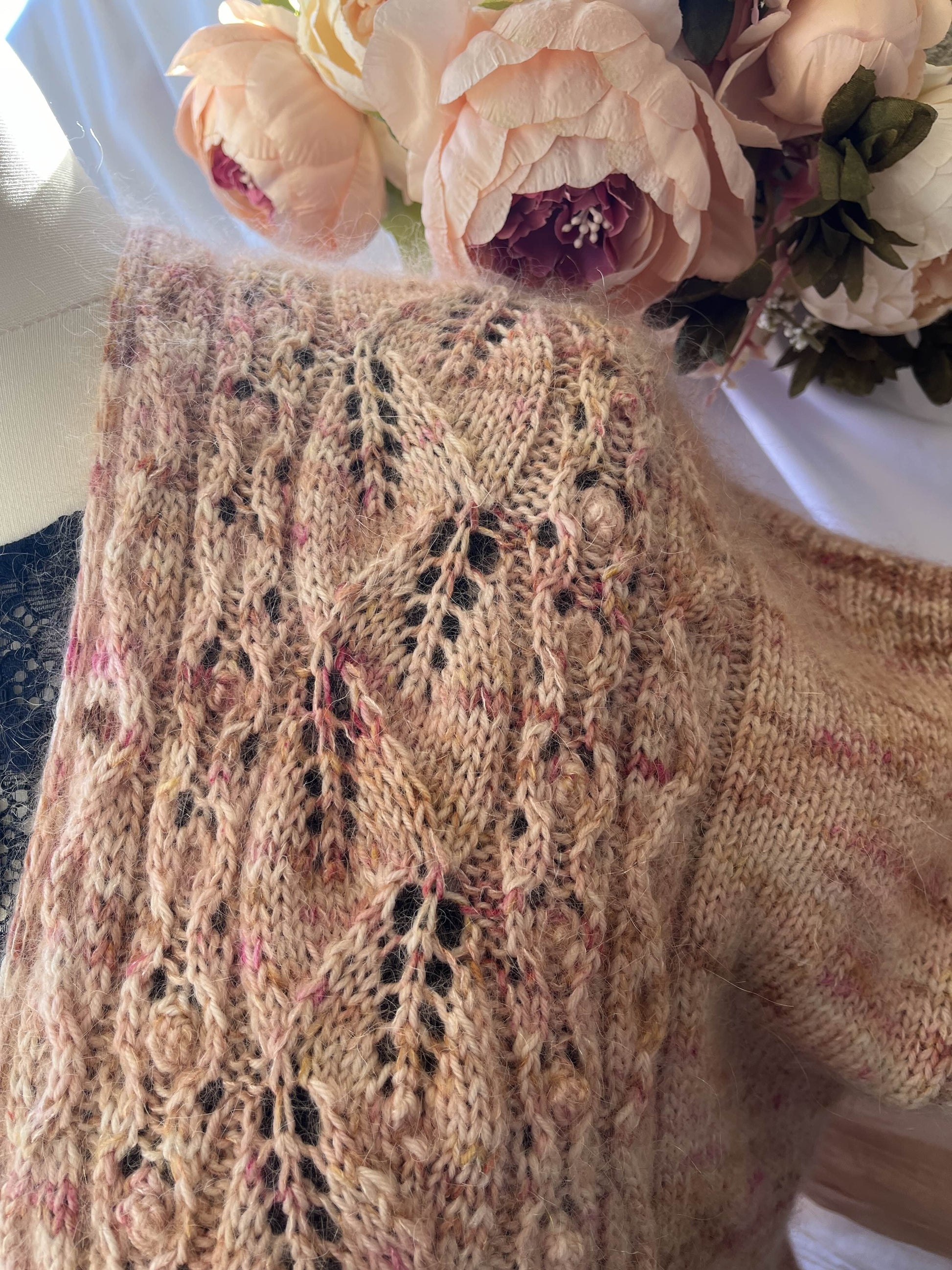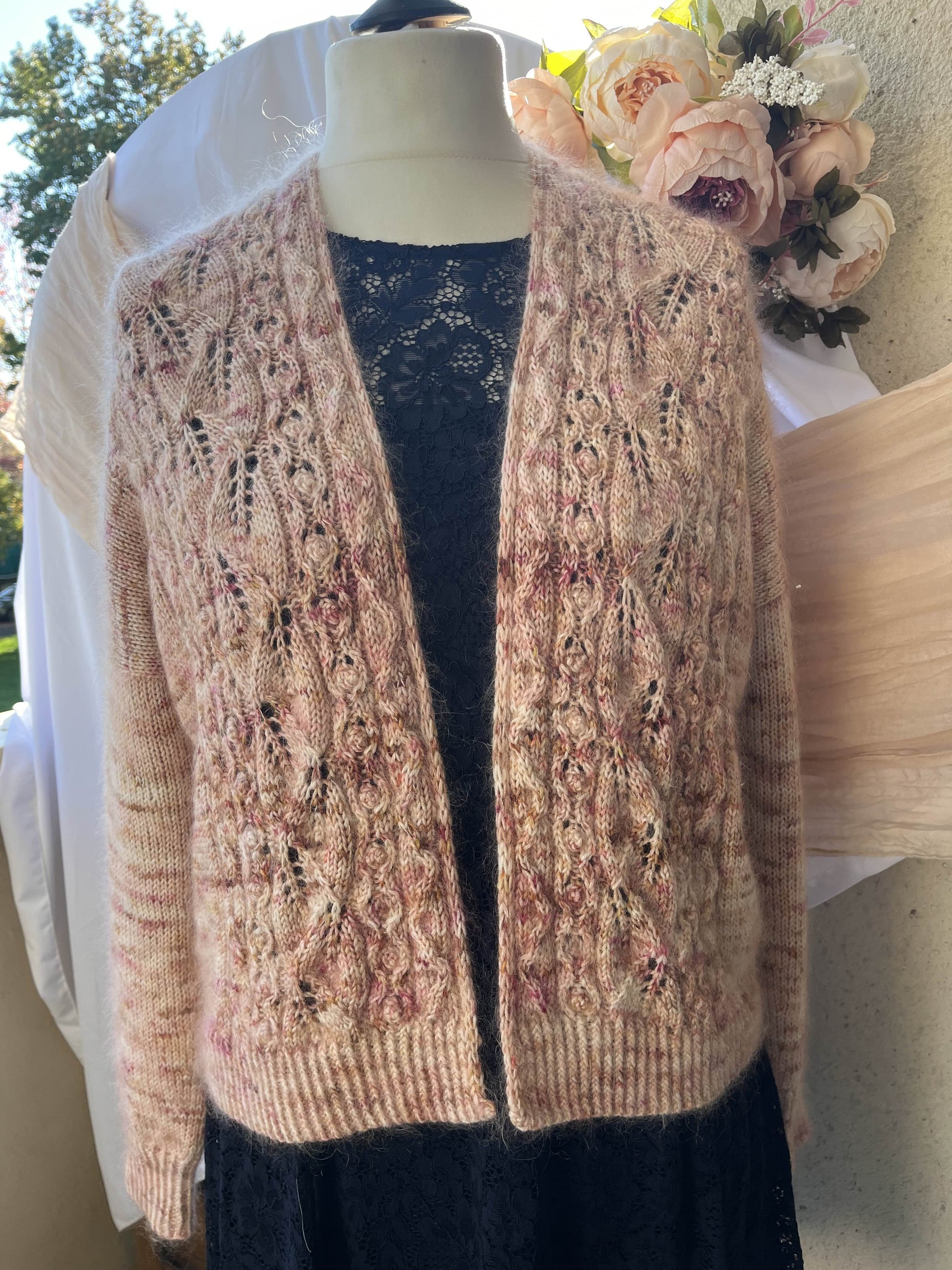 Il s’agit d’un gilet tricoté en épaisseur DK (soit un fil de DK soit un fil de fingering tenu en double avec un mohair) avec une jolie dentelle sur le devant et une finition tricotée au fur et à mesure.
