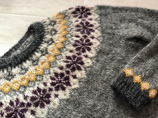 Le pull Hekla est un pull en top down, tricoté en rond sans couture. L'empiècement jacquard traditionnel mettra en valeur tes jolies laines ! Tu pourras retrouver un joli motif de rappel sur les manches et le bas du corps.