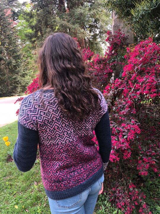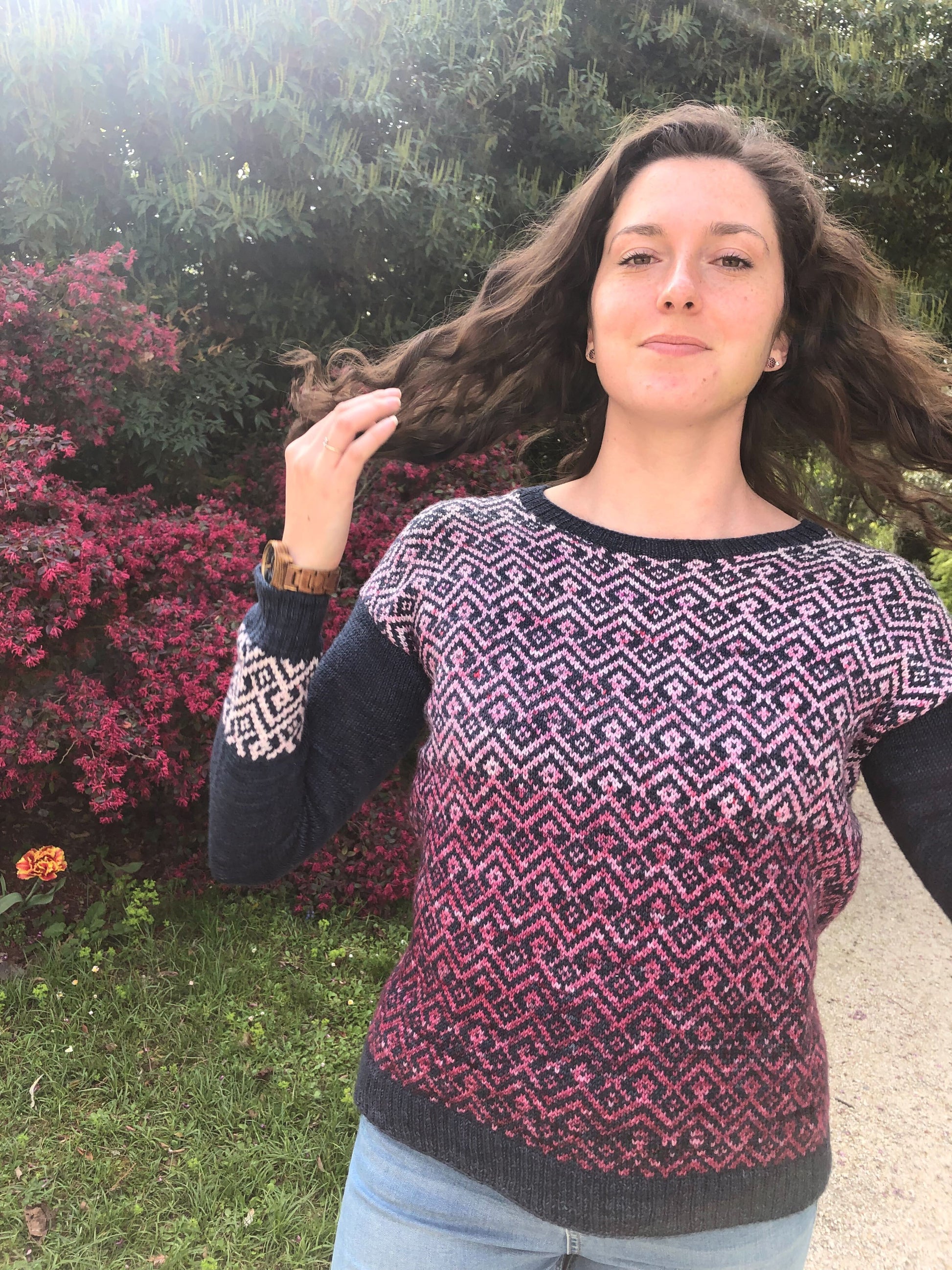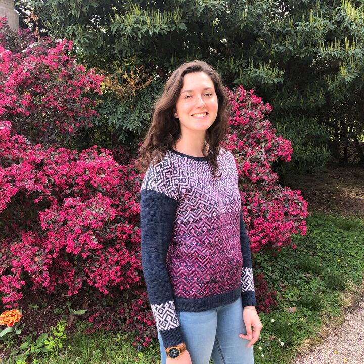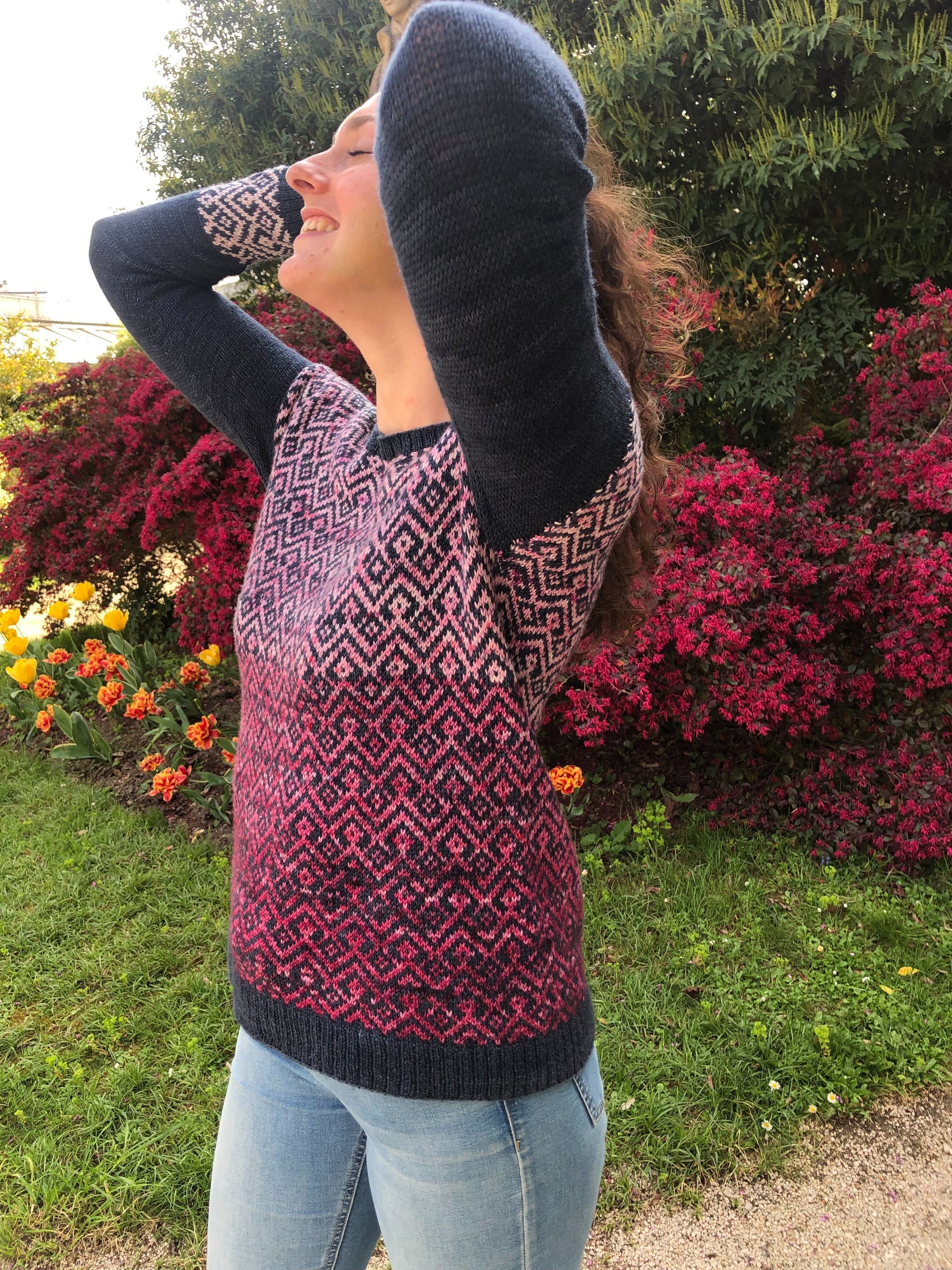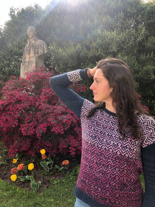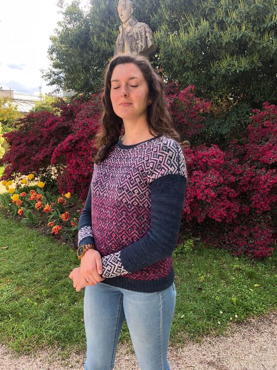 Le pull Bohème est le tout premier patron de la collection Bohème. Il s’agit d’un pull en presque full jacquard et tricoté du bas vers le haut (bottom-up). J’ai dessiné ce motif à la fois sobre et graphique dans un esprit Bohème pour mettre en valeur les jolies gradients de Ludivine, alias Arcoiris Yarns. Les manches sont quant à elles un peu plus sobres pour apporter une touche féminine grâce à ses poignets de manches en rappel du motif principal.