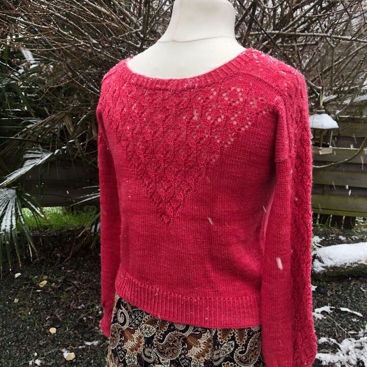 Le pull coffee est tricoté de haut en bas avec une jolie dentelle dans le dos tout comme le gilet Coffee. Il se différencie par des manches tombantes (marteau) ayant une répétition de la dentelle et un joli col V. Proposé en version courte et en version longue, c’est un pull qui s’accordera parfaitement à votre garde-robe pour un look élégant et féminin.