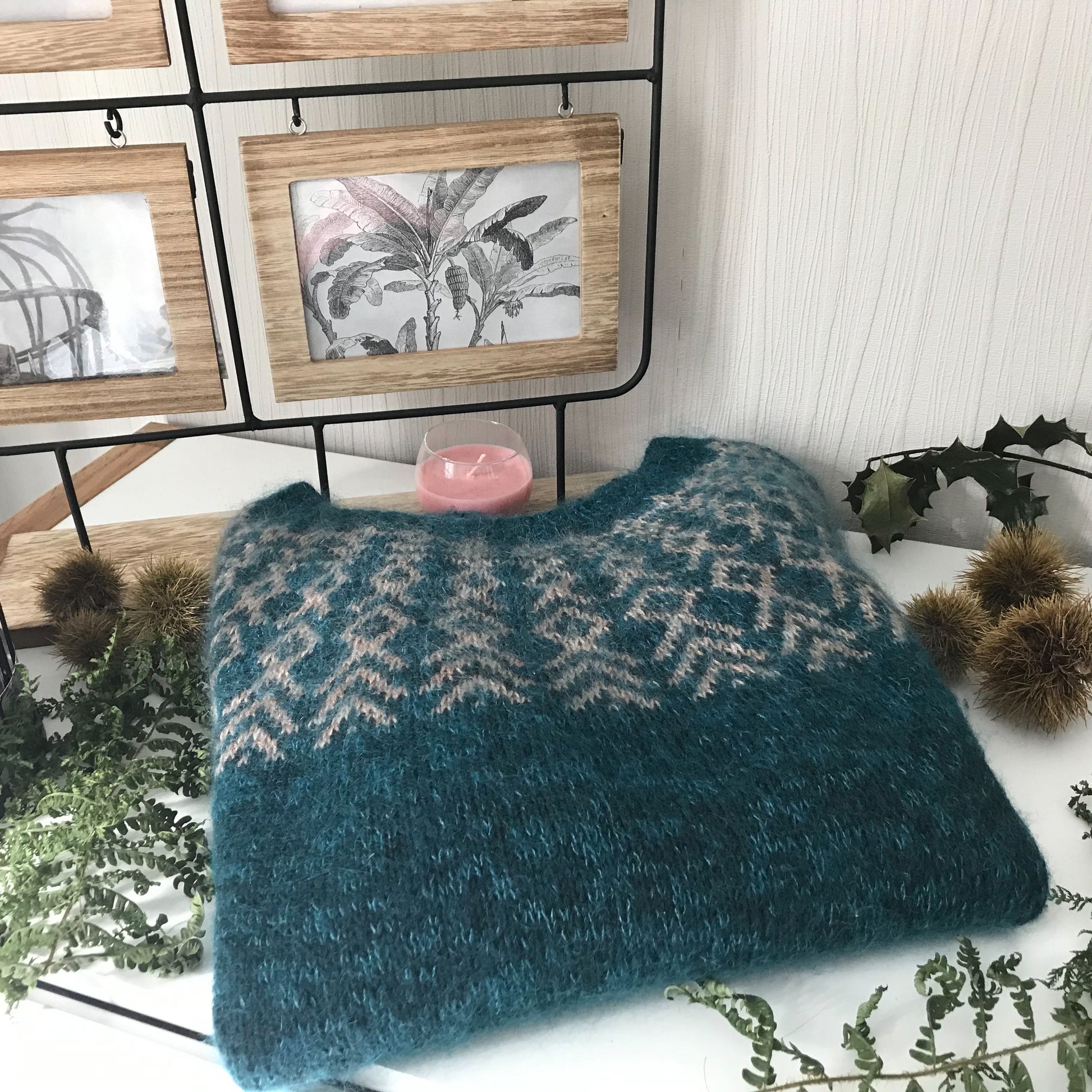 Le modèle présenté est réalisé en laine fingering doublée mohair pour un pull doudou qui t'accompagnera tout l’hiver, tu peux cependant le réaliser en laine type DK pour un effet moins poilu.