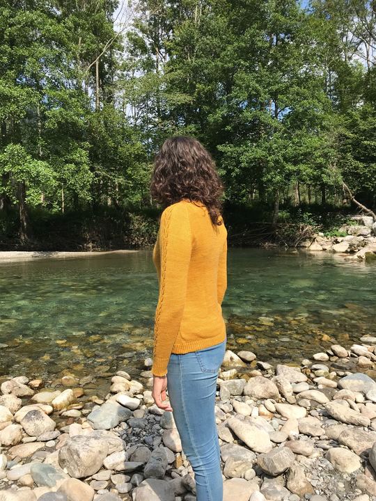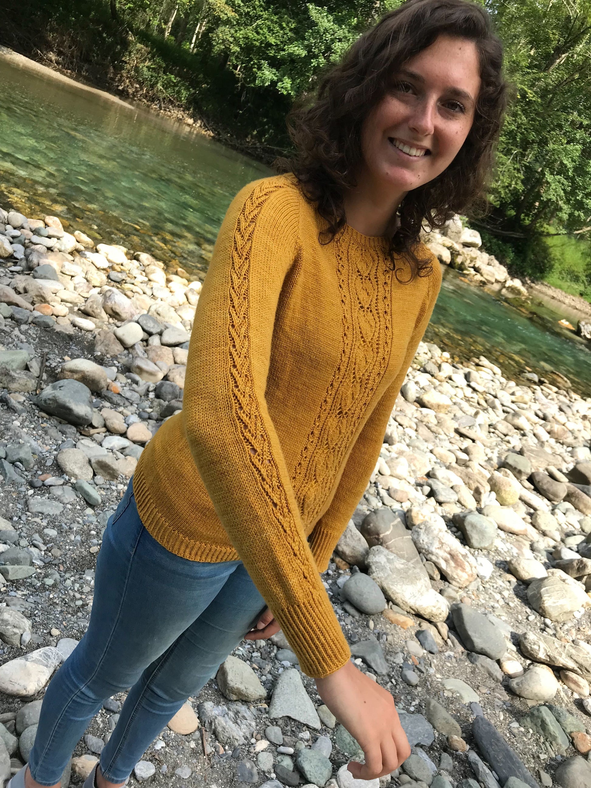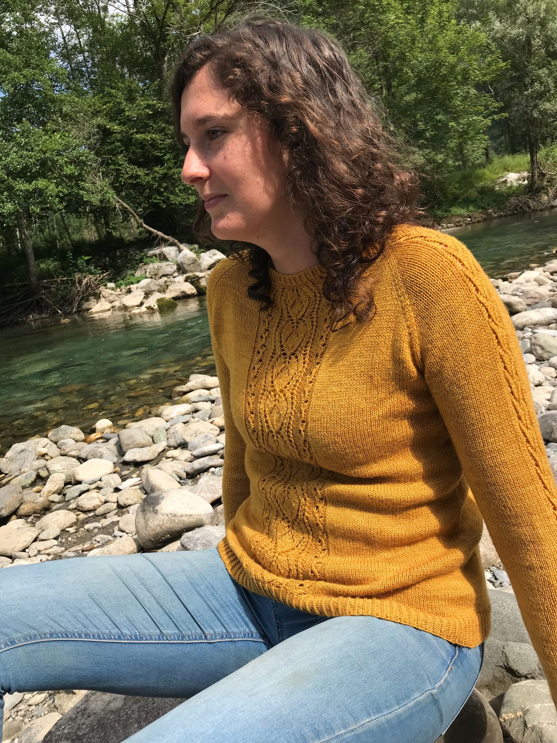 Johanna est un pull top-down, composé de raglans simples et de dentelles sur les manches et le devant. C’est ma petite œuvre d’art pour les 18 ans de ma petite sœur, tricoté en base mérinos de chez Yarneline, coloris Mme Bonheur.