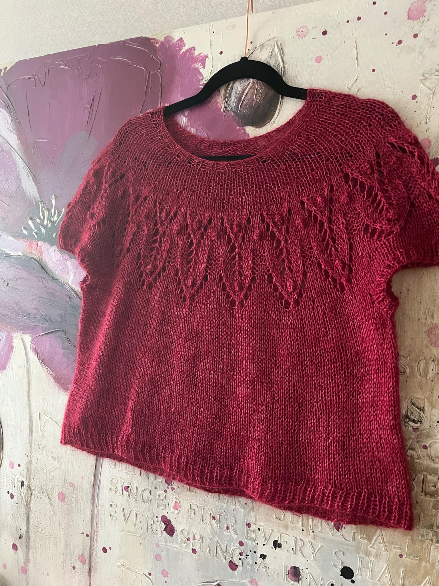 Tricoté d’une seule pièce, du haut vers le bas, il met en valeur un magnifique empiècement circulaire orné d’un motif de feuilles ajourées, comme une couronne végétale posée délicatement sur les épaules.