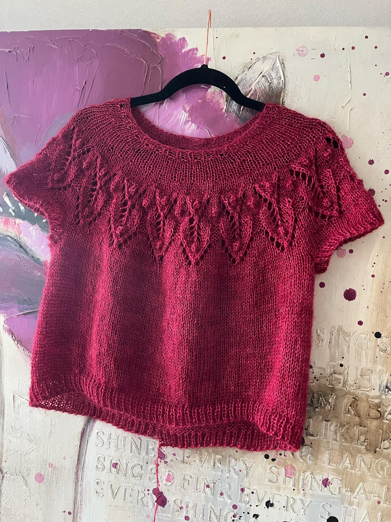 Ses manches courtes et sa coupe légèrement ample en font une pièce confortable et élégante, facile à porter au quotidien. Le motif de dentelle rythme le début du tricot dans une construction en rond intuitive, avec juste ce qu’il faut de détails pour captiver les aiguilles sans jamais décourager. Une jolie façon d’ajouter une touche de féminité dans un vêtement simple et doux.