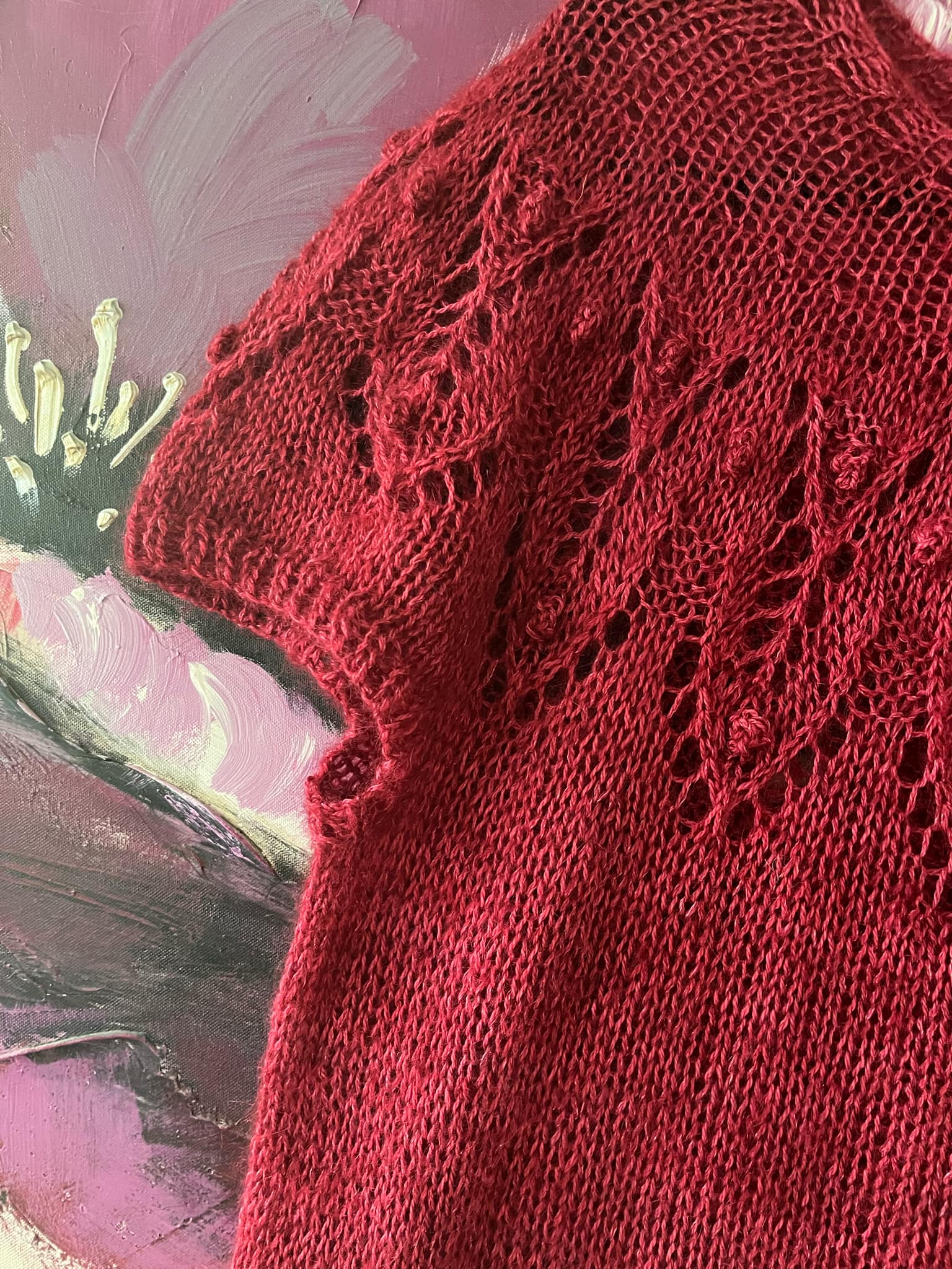 - 1-1-2 (2-2-2) 3-3 écheveaux de Kid Mohair et Soie de Teinturlurée (420 m/50 gr), présenté en coloris So Berry Good.