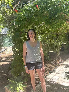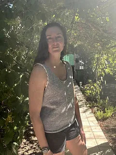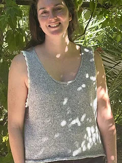 Un débardeur tout simple, tout doux, tricoté en jersey, avec cette petite touche de fantaisie en plus : des finitions au crochet qui soulignent délicatement l’encolure et les emmanchures, comme une bordure de dentelle légère posée sur la peau. Cléo, c’est un vêtement qu’on tricote sans pression, avec le plaisir des gestes simples.